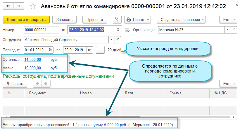 В авансовом отчете достаточно указать командированного сотрудника и период командировки, тогда билеты, суточные и выданные авансы заполнятся по этим данным.