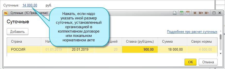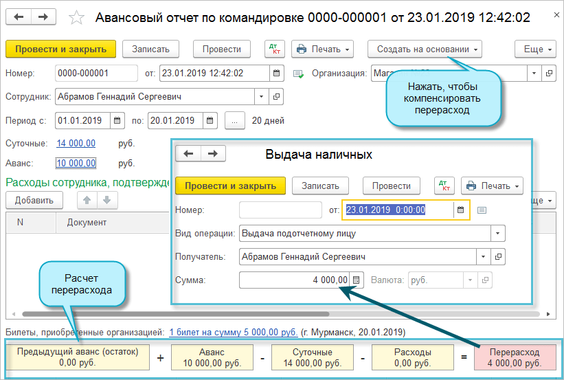 В нижней части формы Авансового отчета по командировкам проиллюстрирован расчет перерасхода по командировке.