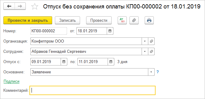 Отпуск за свой счет отражается документом "Отпуск без сохранения оплаты".