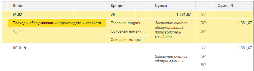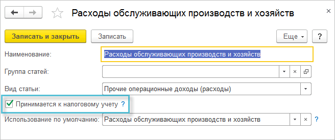Если организация принимает расходы обслуживающих производств и хозяйств в налоговом учете, согласно пп. 48 п. 1 ст. 264 НК РФ, то необходимо установить флажок "Принимается к налоговому учету" в статье прочих расходов "Расходы обслуживающих производств и хозяйств".