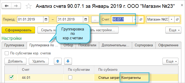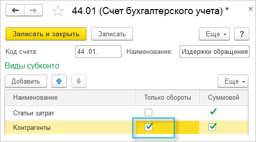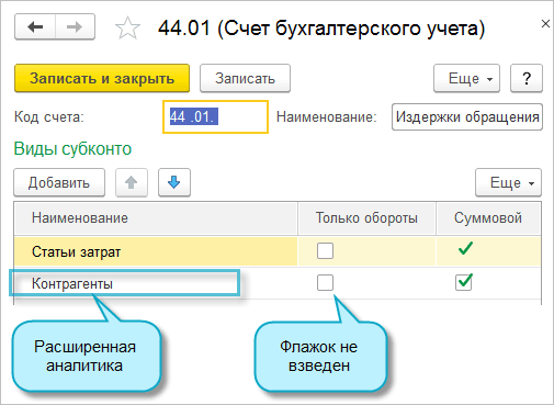 Если имеется потребность анализировать расходы на продажу и управленческие расходы в разрезе Направлений деятельности, Контрагентов, Проектов, Сотрудников и т.п., то необходимо расширить состав используемой аналитики на счете 26 "Общехозяйственные расходы" или 44 "Издержки обращения" - добавить субконто. Чтобы в отчетах по счетам финансового результата отразились данные о расходах в разрезе добавленных субконто, достаточно выполнить следующие действия: