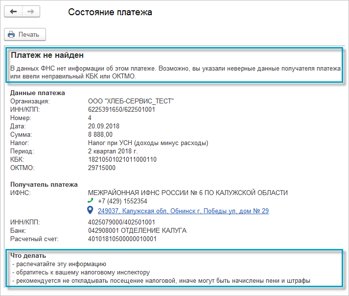При нажатии на гиперссылку "Не найден" открывается печатная форма "Состояние платежа" с подробной информацией и инструкцией для дальнейших действий.