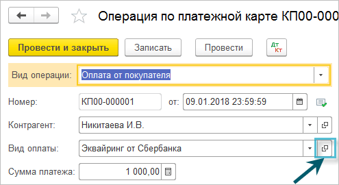 Полный интерфейс: меню "Банк и касса - Касса - Операции по платежным картам".