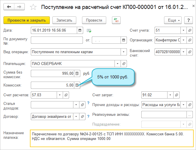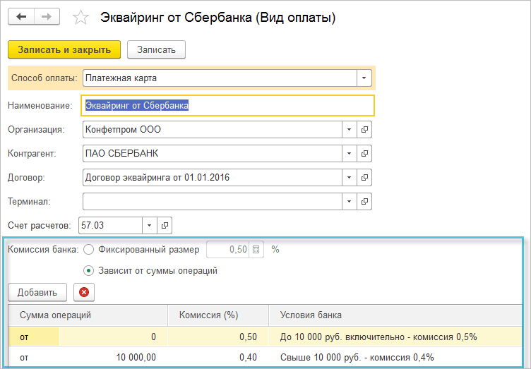Если организация принимает оплату платежными картами, то при вводе поступления на расчетный счет не потребуется вручную заполнять сумму комиссии банка. Достаточно указать правила расчета комиссии в справочнике "Виды оплат".