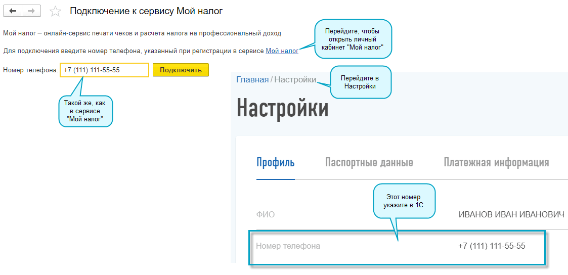 Полный интерфейс: меню "Администрирование - Настройки программы - Подключение к сервису Мой налог".
