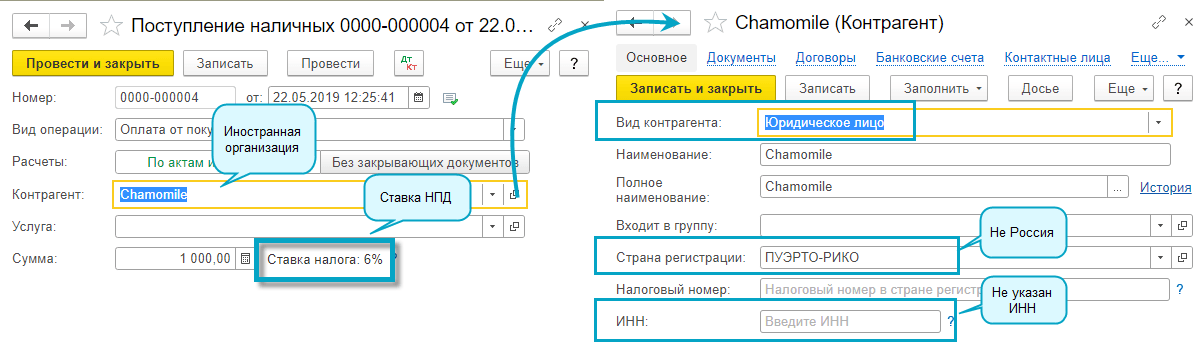 Самозанятые могут выдавать чеки не только российским организациями, но и иностранным. В карточке такого контрагента укажите страну регистрации отличную от "Россия" и не заполняйте ИНН.