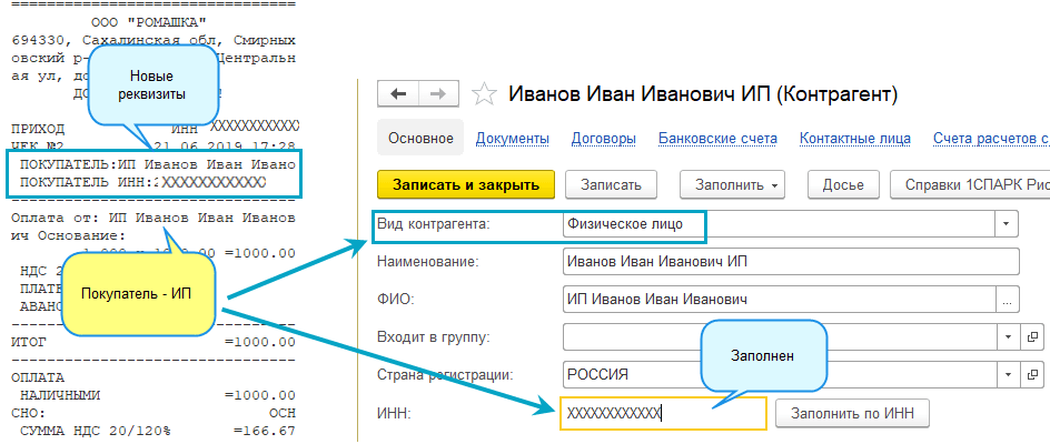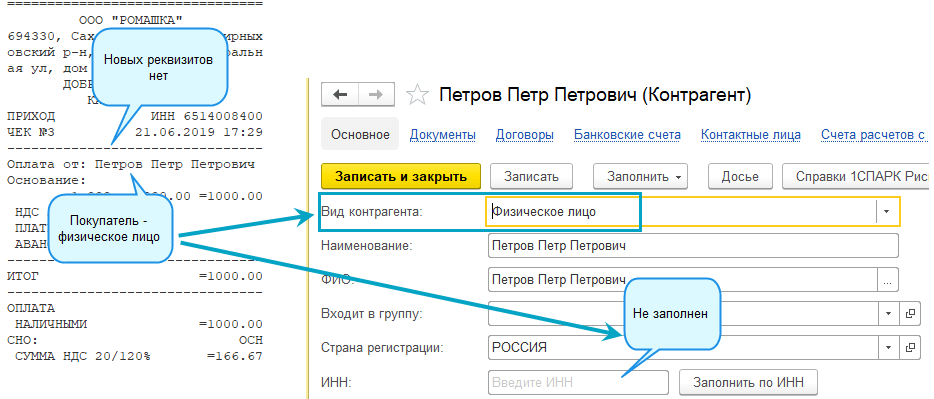 Добавлены новые обязательные реквизиты в чеки ККТ - наименование и ИНН покупателя. Эти реквизиты заполнятся в чеке ККТ, начиная с 01.07.19, при расчетах наличными с юридическими лицами и индивидуальными предпринимателями. А также оплате по платежной карте.