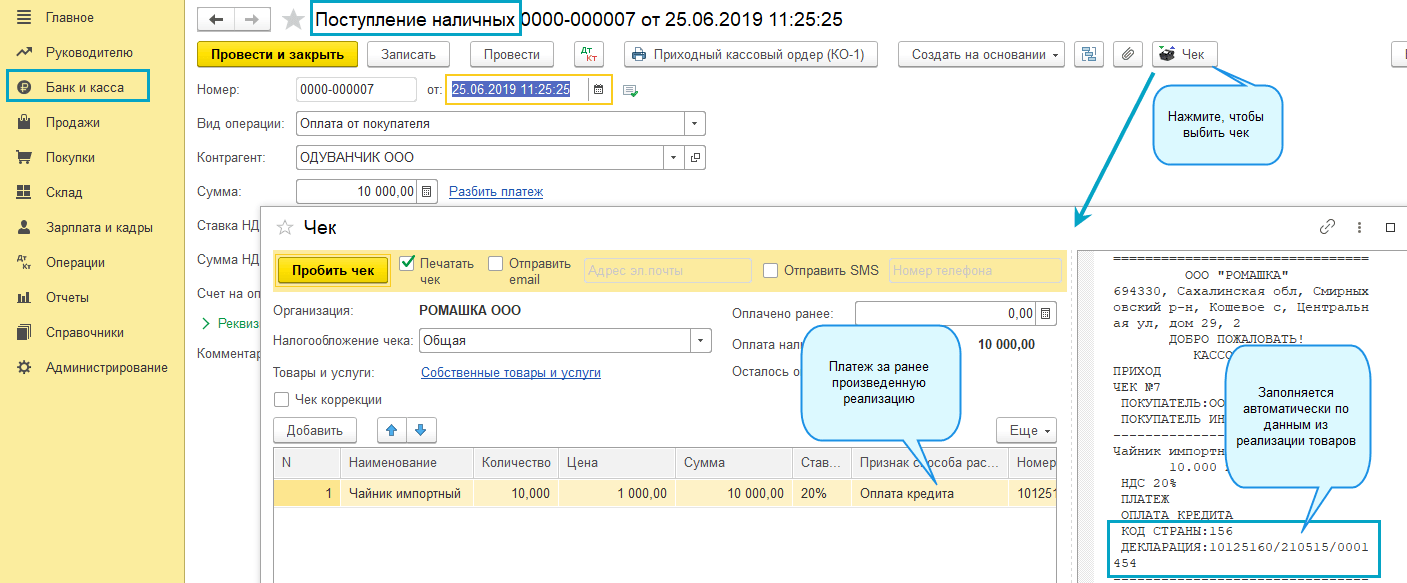 Добавлена возможность пробивать чеки при оформлении отгрузки из документа "Реализация (акты, накладные)". В соответствии с требованиями Федерального закона от 22.05.2003 № 54-ФЗ "О применении контрольно-кассовой техники при осуществлении расчетов в Российской Федерации" такие чеки нужно пробивать с 01.07.2019.