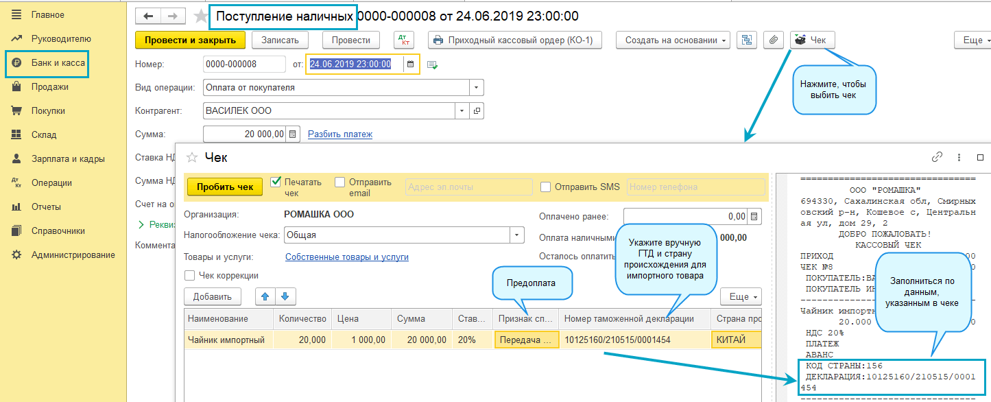 Добавлены новые обязательные реквизиты в чеки ККТ - страна происхождения и ГТД. Эти реквизиты заполнятся в чеке ККТ, начиная с 01.07.19, при расчетах за импортные товары.