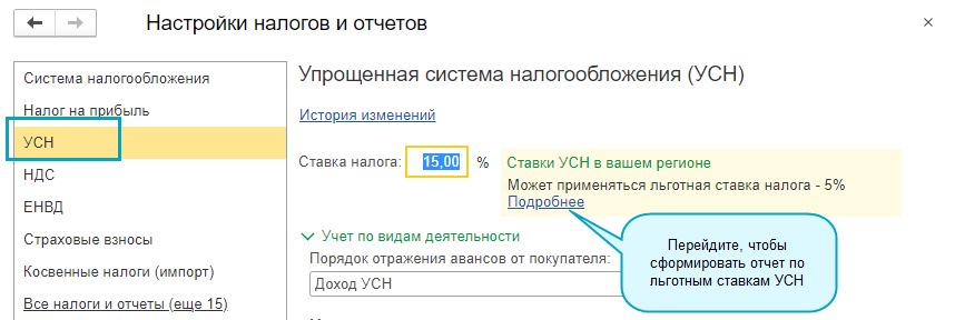 Простой интерфейс: меню "Настройки - Настройка налогов и отчетов".