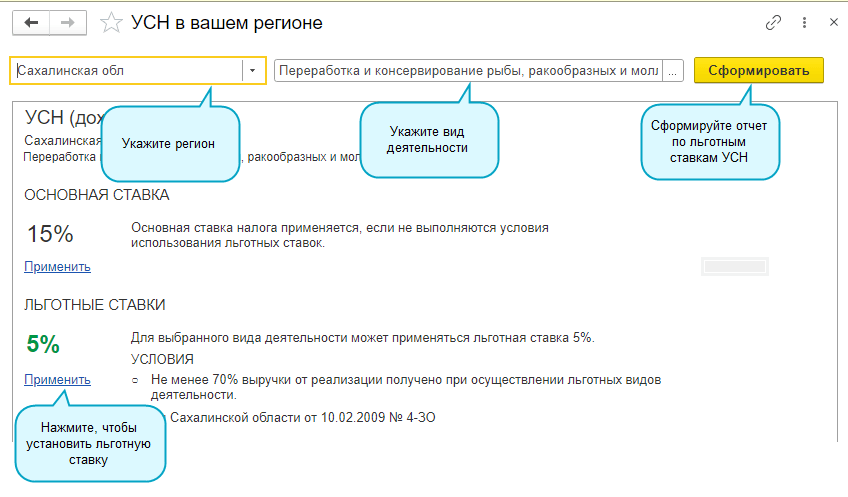 Добавлен сервис информирования о льготных ставках налога при УСН. Сервис доступен только для пользователей 1С:БухОбслуживания.