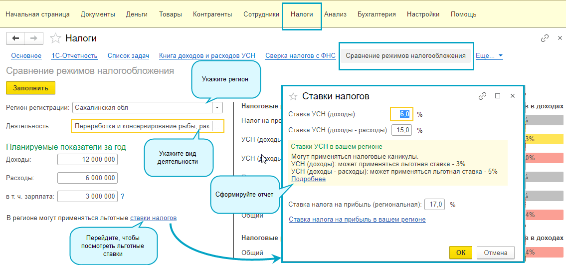 Полный интерфейс: "Руководителю - Планирование - Сравнение режимов налогообложения".
