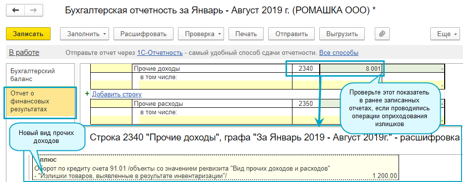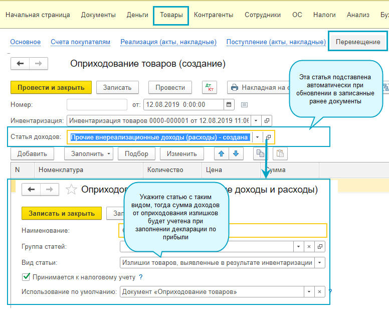 Добавлен новый вид прочих доходов "Излишки товаров, выявленные в результате инвентаризации". Этот вид добавлен, чтобы из прочих