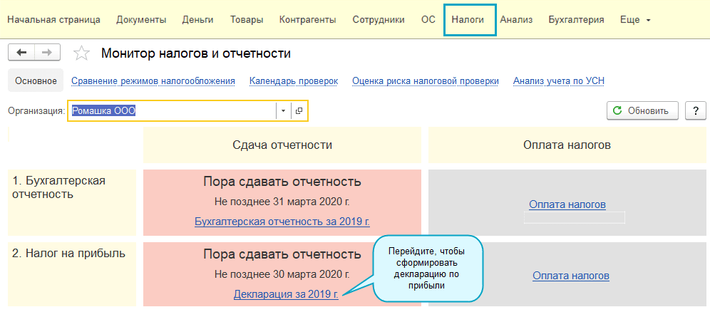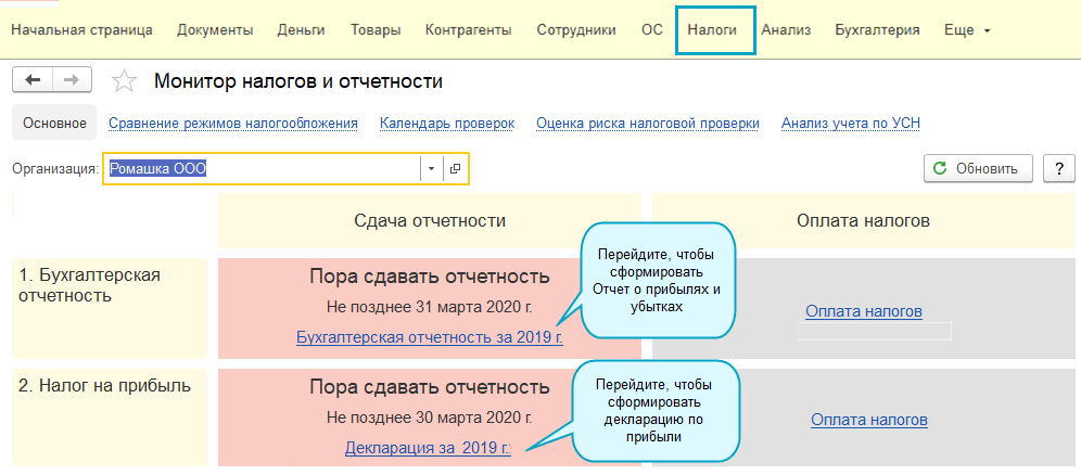 Полный интерфейс: "Главное - Налоги и отчеты".