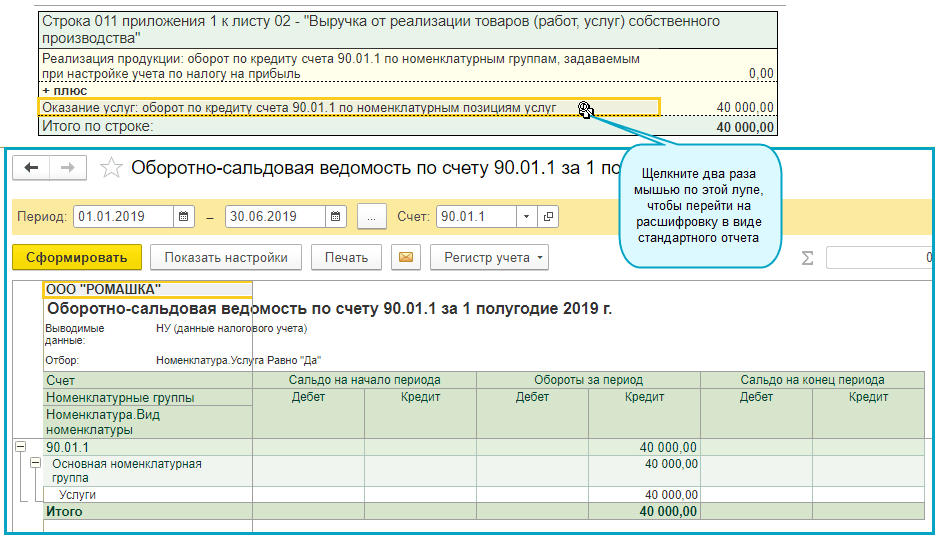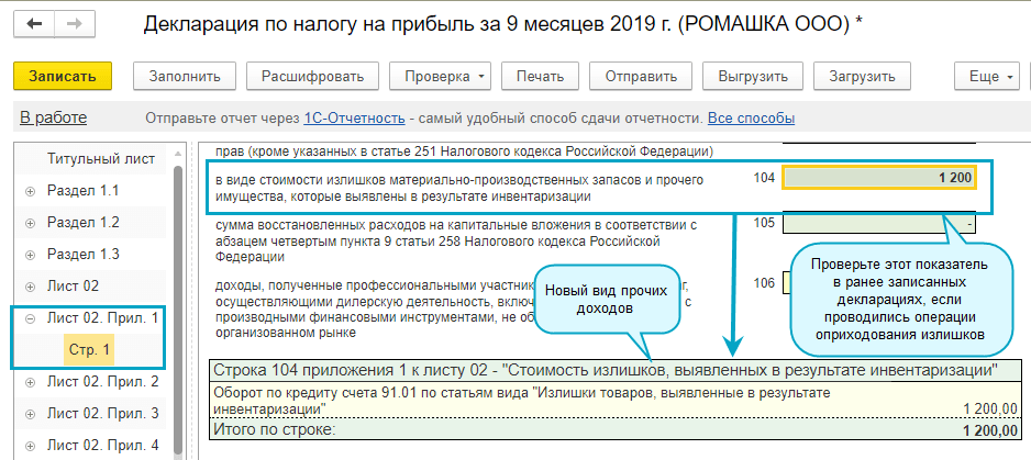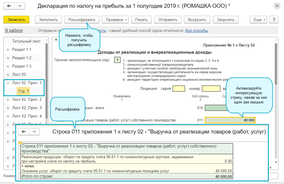 Добавлена возможность расшифровки показателей доходов в декларации по прибыли.