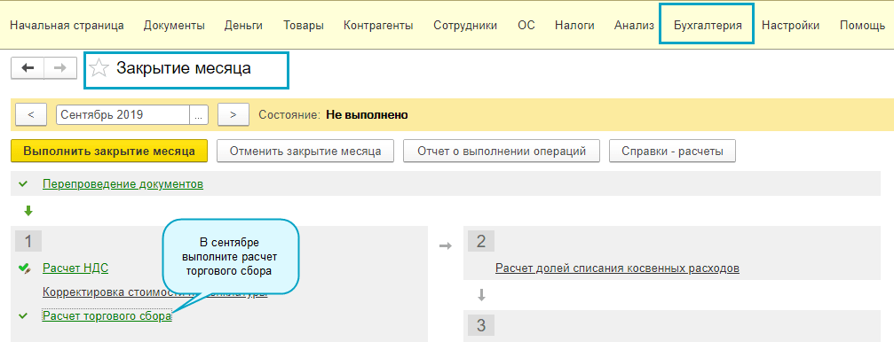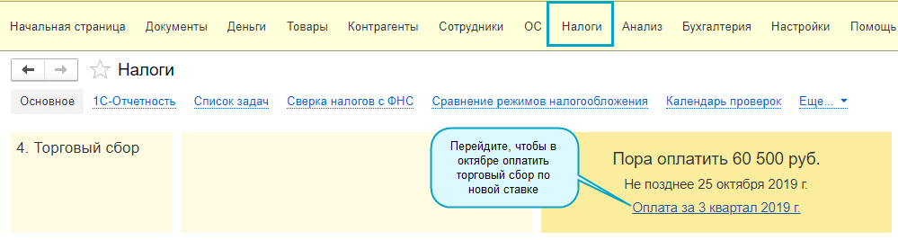 Полный интерфейс: меню "Главное - Налоги и отчеты - Торговый сбор".