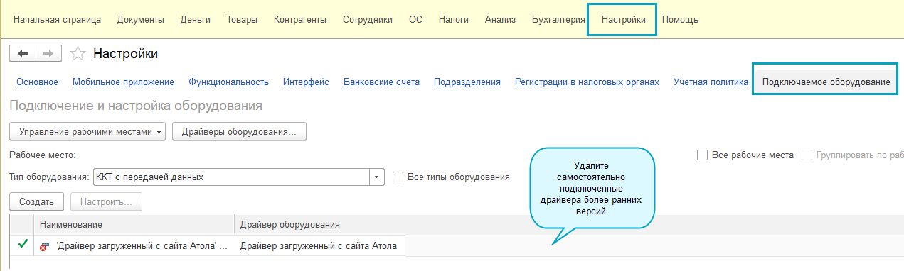Настройка подключаемого оборудования возможна только в Тонком клиенте.