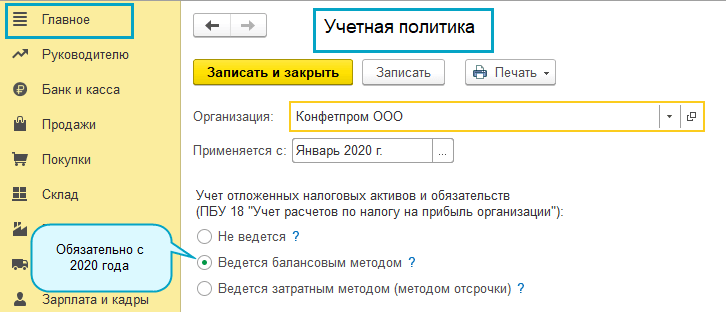 Для организаций, применяющих ПБУ 18, в учетную политику добавлена запись о том, что с 2020 года учет отложенных налоговых активов и обязательств ведется балансовым методом.