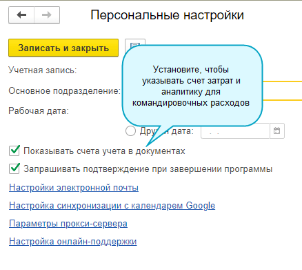 Добавлена возможность указывать счет учета затрат для командировочных расходов в Авансовом отчете по командировке. Для этого достаточно сделать следующую настройку: