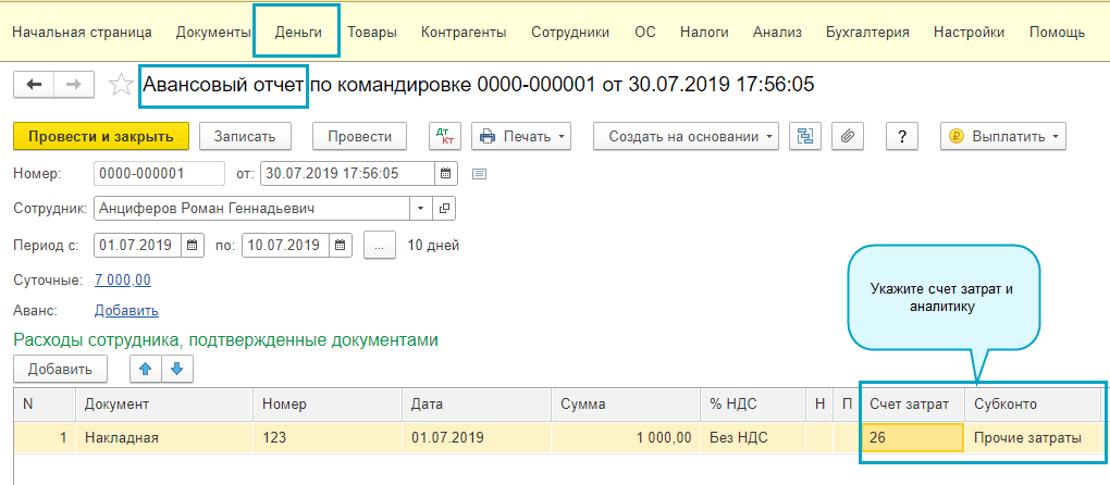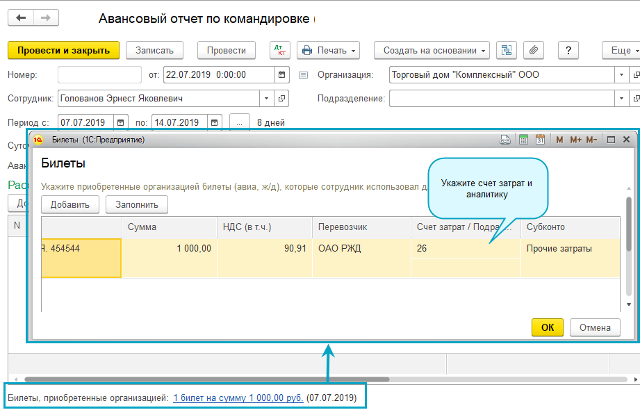 Тогда счета учета затрат и аналитика появятся в Авансовом отчете по командировкам.