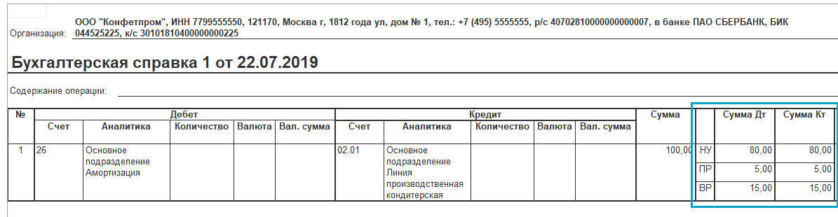 В печатной форме бухгалтерской справки добавлено заполнение данных по налоговому учету, постоянным и временным разницам.