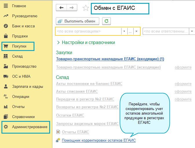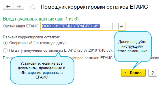 Добавлен помощник корректировки остатков ЕГАИС. Он помогает сверить данные по остаткам алкогольной продукции в вашей ИБ и в регистрах ЕГАИС. А также сформировать документы оприходования и списания для корректировки регистров ЕГАИС.
