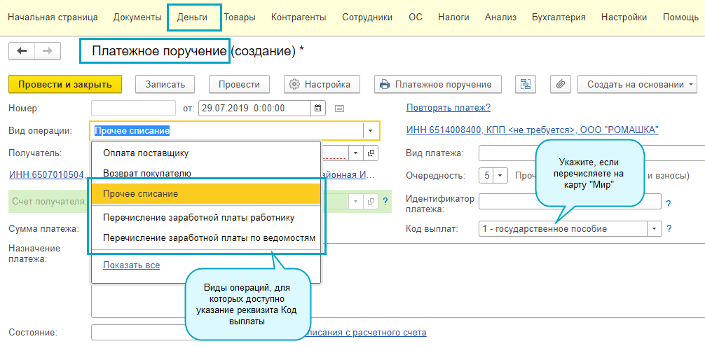 В платежное поручение добавлен реквизит "Код выплат" для тех случаев, когда перечисление пособия за счет ФСС производится на карту "Мир". С 01.07.2020 пособия по материнству и другие пособия за счет ФСС необходимо перечислять на карту "Мир". Требование вступило в силу с 01.05.2019, но до конца текущего года не является обязательным, если у получателя имеется другая карта.