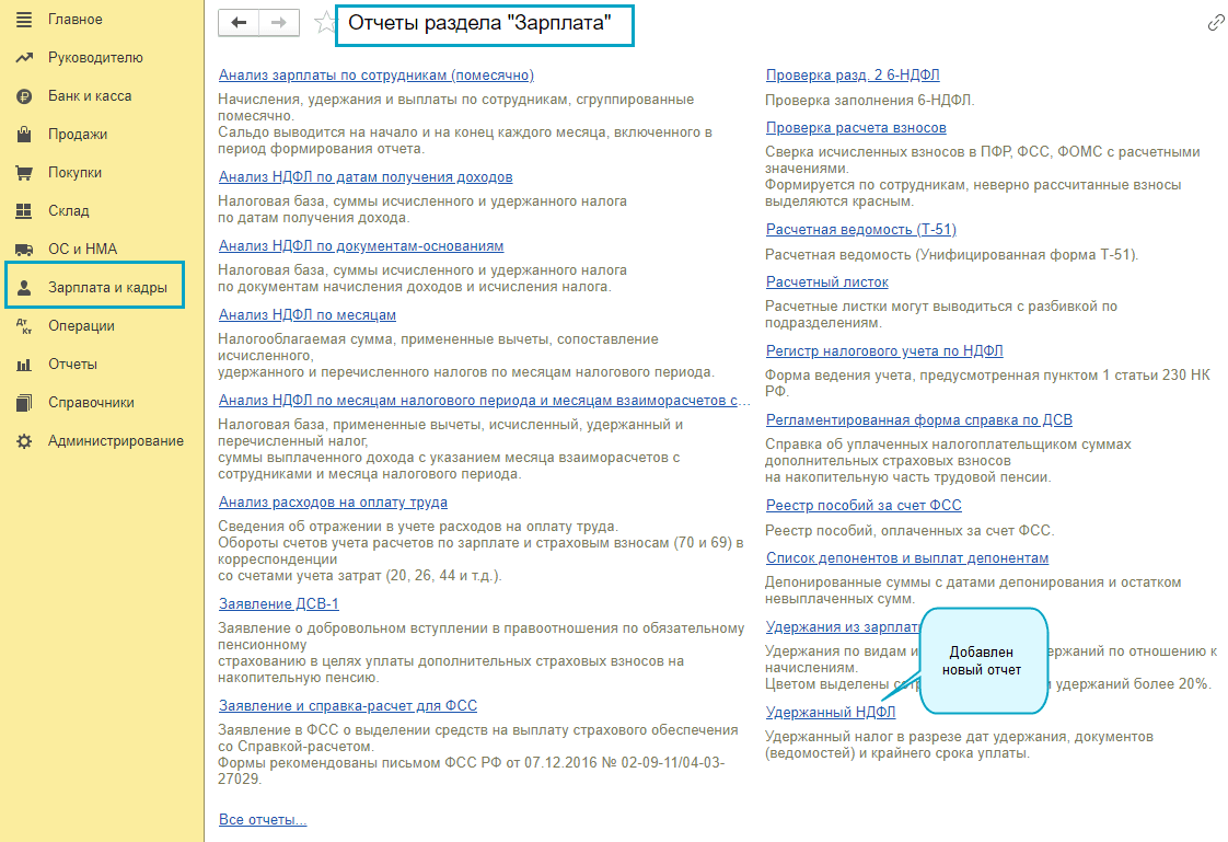 Добавлен отчет "Удержанный НДФЛ". Отчет отражает удержанный НДФЛ в разрезе документов, дат удержания и крайнего срока уплаты.