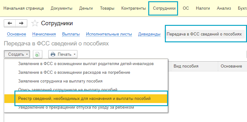 Полный интерфейс: "Зарплата и кадры - Пособия за счет ФСС".