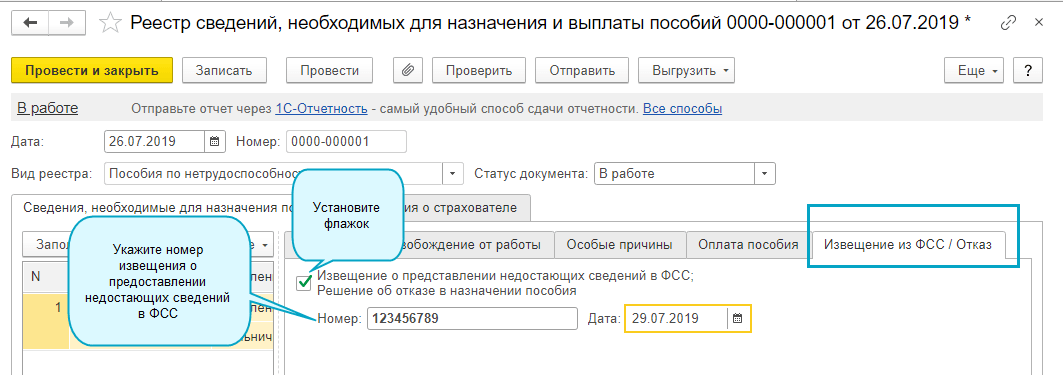 Для участников пилотного проекта ФСС в реестр пособий ФСС добавлена страница "Извещение ФСС / Отказ". Укажите номер и дату извещения из ФСС на этой странице, если необходимо исправить заявление без внесения исправлений в расчет пособия.