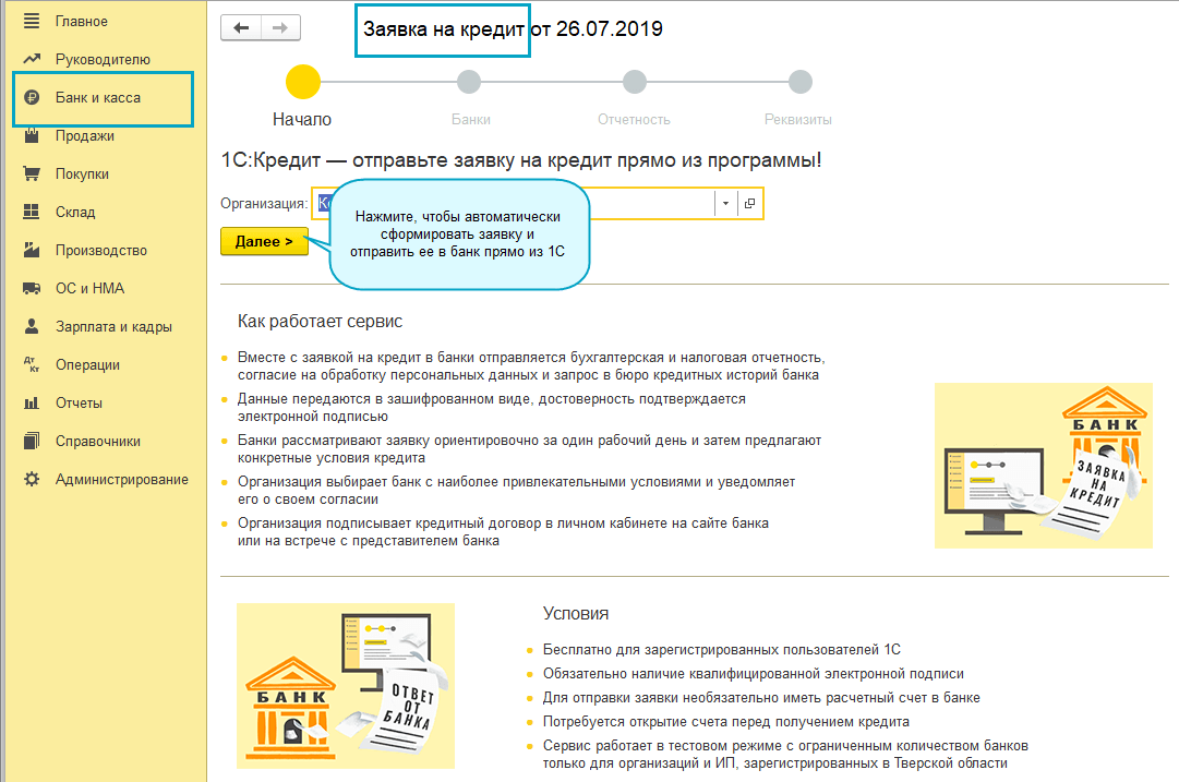 Добавлен сервис 1С:Кредит для отправки заявок на кредит прямо из программы. Сервис использует электронную подпись для ЭДО или для 1С:Отчетности. Сервис работает в тестовом режиме с ограниченным количеством банков и только для организаций и ИП, зарегистрированных в Тверской области.