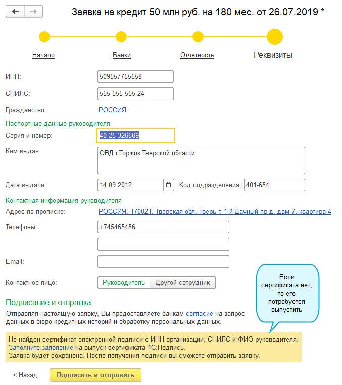 Отправка заявок доступна пользователям с полными правами и правами главного бухгалтера.