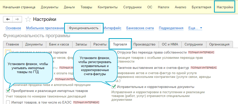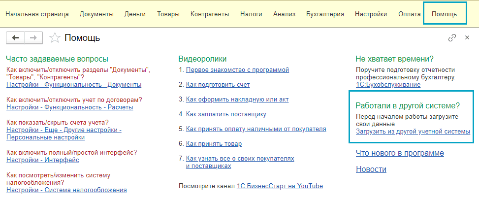 Полный интерфейс: меню "Главное - Начало работы - Загрузка из другой учетной системы".