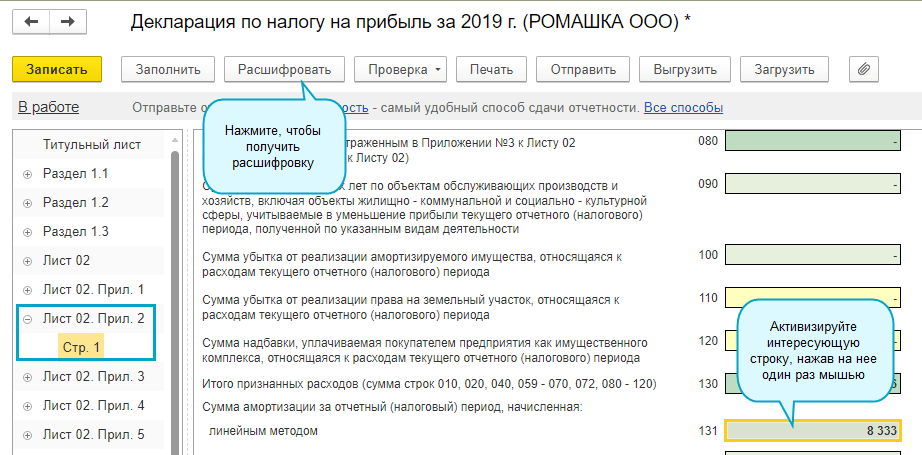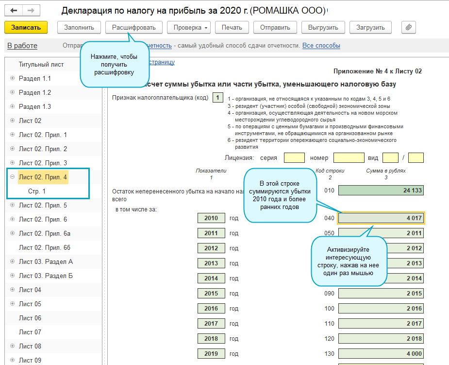 Добавлена возможность отражения и расшифровки в декларации по прибыли показателей убытков прошлых десяти лет и более.