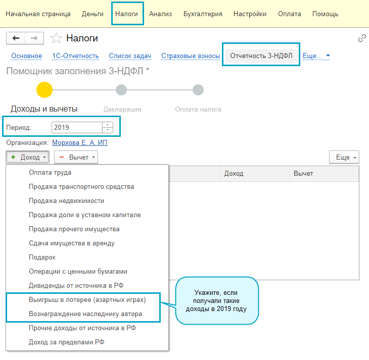 Полный интерфейс: меню "Отчеты - Помощник заполнения 3-НДФЛ".