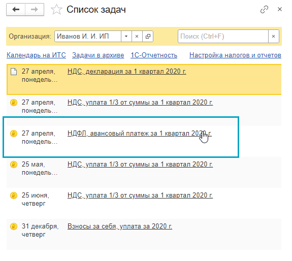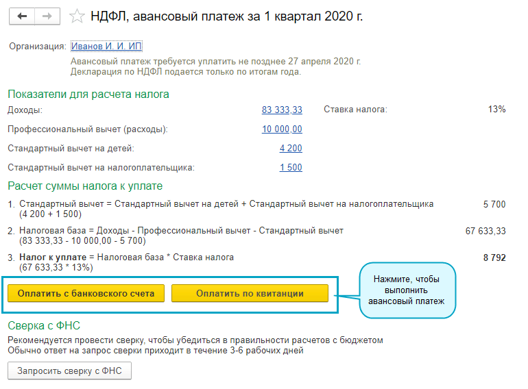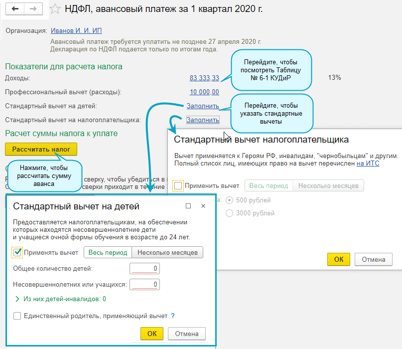 Добавлен расчет авансовых платежей по НДФЛ для ИП на общей системе. С 01.01.2020 индивидуальные предприниматели самостоятельно исчисляют авансовые платежи и уплачивают их в следующие сроки: