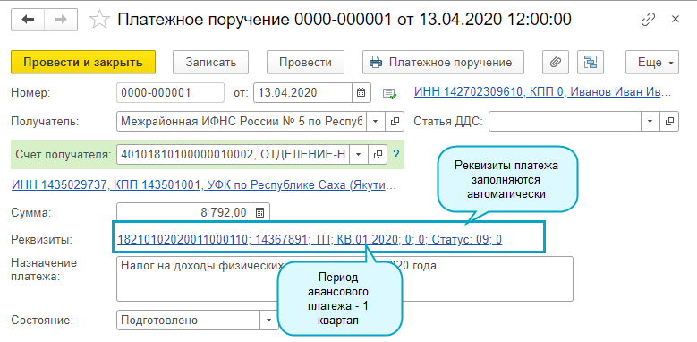 После нажатия на кнопку Рассчитать налог в закрытии месяца создается регламентная операция Расчет НДФЛ для ИП, в ней фиксируется сумма аванса. Эту сумму предлагается уплатить на следующем шаге помощника.