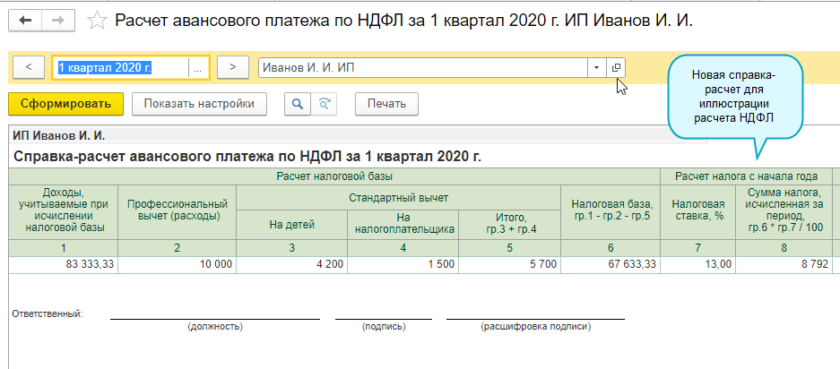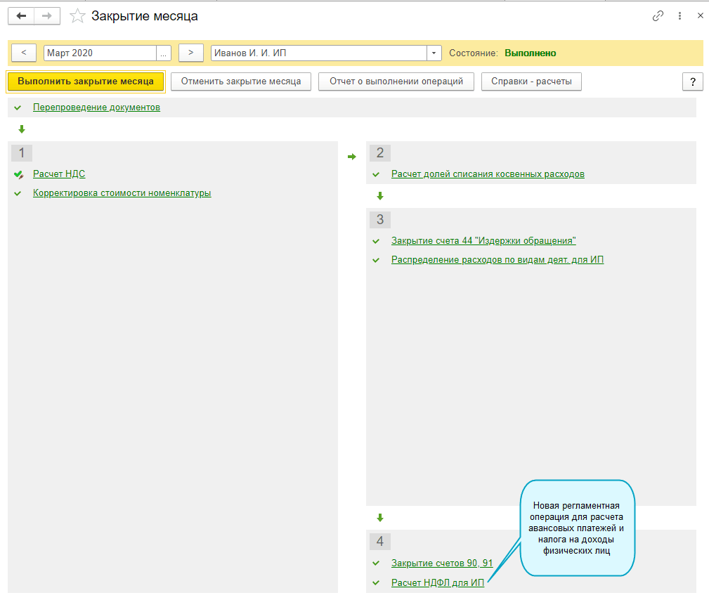 В закрытие месяца добавлена новая регламентная операция Расчет НДФЛ для ИП. Специально создавать ее не требуется, она формируется автоматически помощником по НДФЛ.
