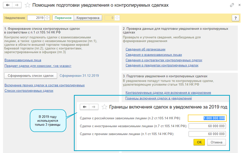 Полный интерфейс: меню "Отчеты - Контролируемые сделки - Помощник подготовки уведомления - 3.Подготовка уведомления о контролируемых сделках"