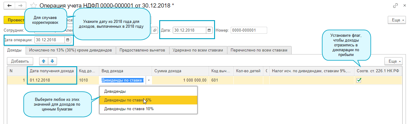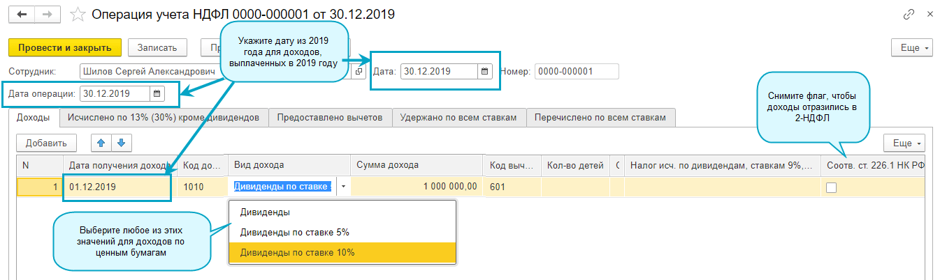 Для Расчета сумм налога на доходы физических лиц, исчисленных и удержанных налоговым агентом (форма 6-НДФЛ) в редакции приказа ФНС России от 17.01.2018 № ММВ-7-11/18@ реализованы указания письма ФНС России от 12.12.2019 № БС-4-11/25600@.