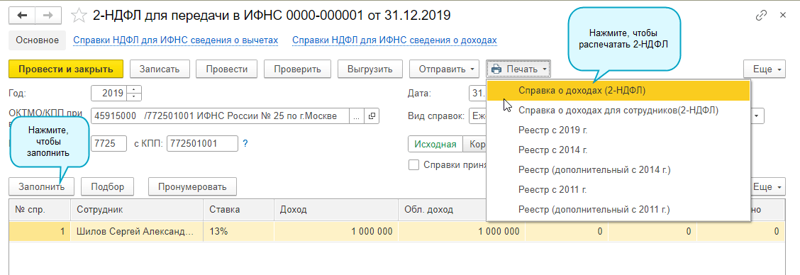 Полный интерфейс: меню "Зарплата и кадры - НДФЛ - 2-НДФЛ для передачи в ИФНС".