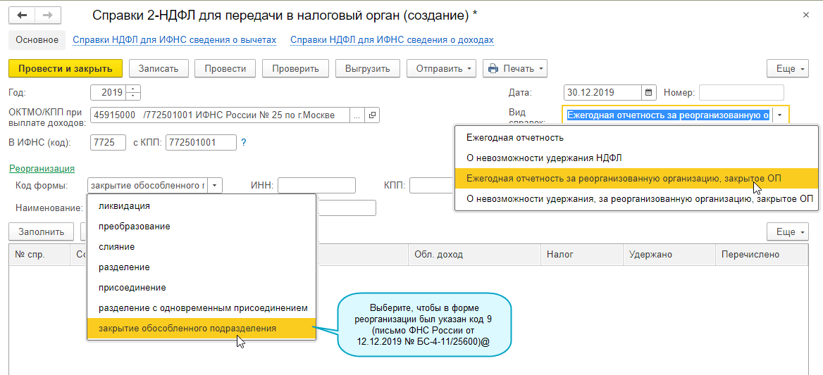 Добавлено заполнение кода 9 в форме реорганизации в справке 2-НДФЛ для ИФНС (Письмо ФНС России от 12.12.2019 № БС-4-11/25600@)
