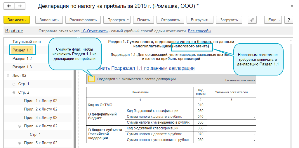 Для упрощения включения и исключения отдельных листов в декларацию по прибыли добавлен специальный флажок на те страницы, которые могут быть исключены из декларации: