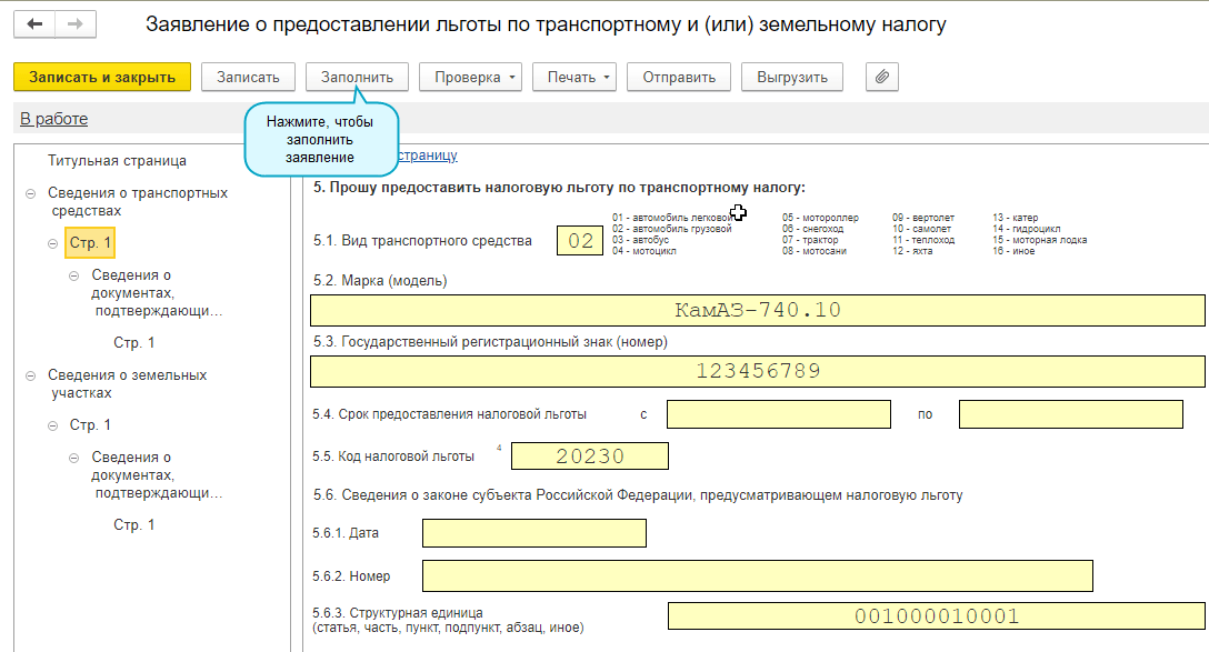 Если указать сведения о льготах по транспортному и земельному налогу, то в списке задач появится заявление о льготах.