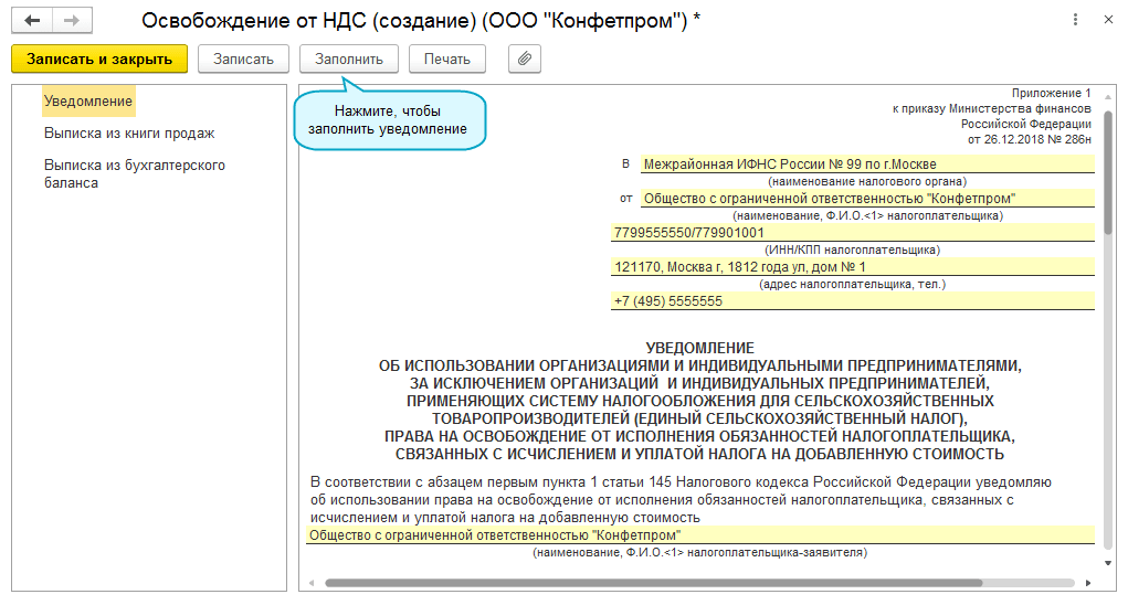 Теперь уведомление об освобождении от уплаты НДС заполняется автоматически на основании данных учета.