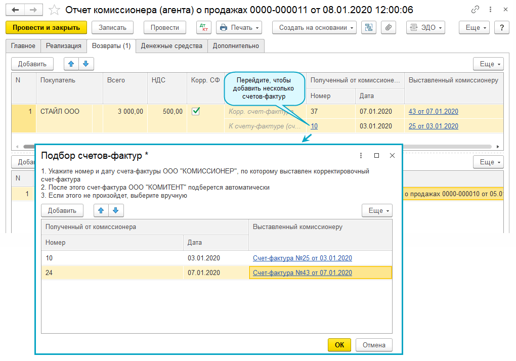 В случае возврата товаров в Отчете комитенту выводятся данные о выданном покупателю корректировочном счете-фактуре.