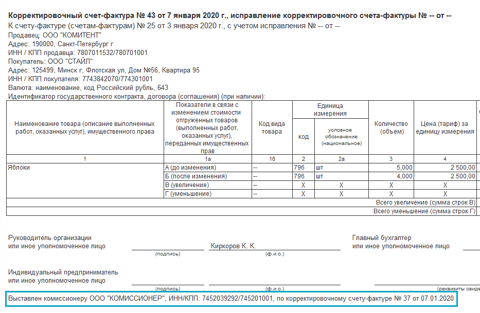 В печатную форму перевыставленного корректировочного счета-фактуры комитента добавлены дополнительные реквизиты с информацией о данных корректировочного счета-фактуры комиссионера.
