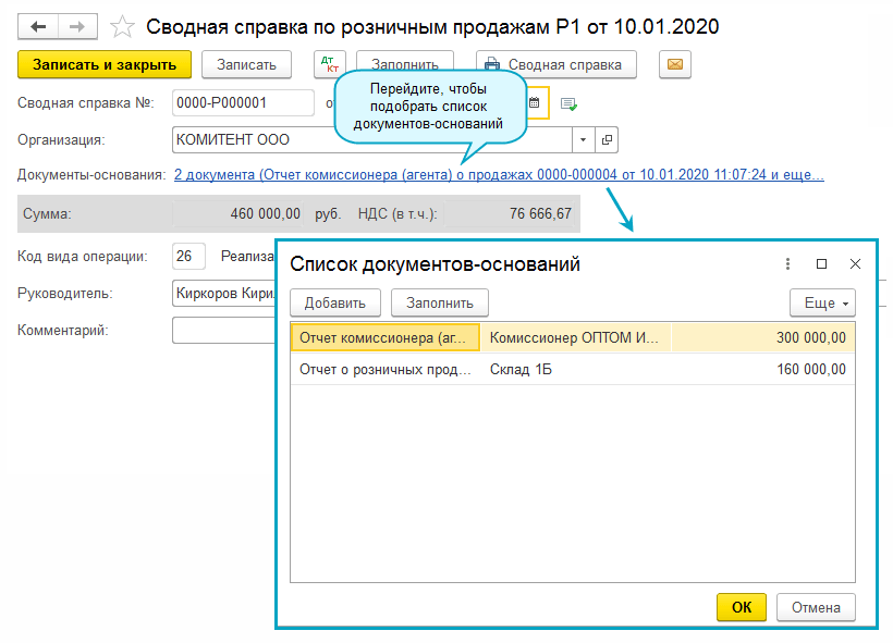 При розничной продаже комиссионных товаров в учете комитента-продавца можно оформить Сводную справку по розничным продажам.