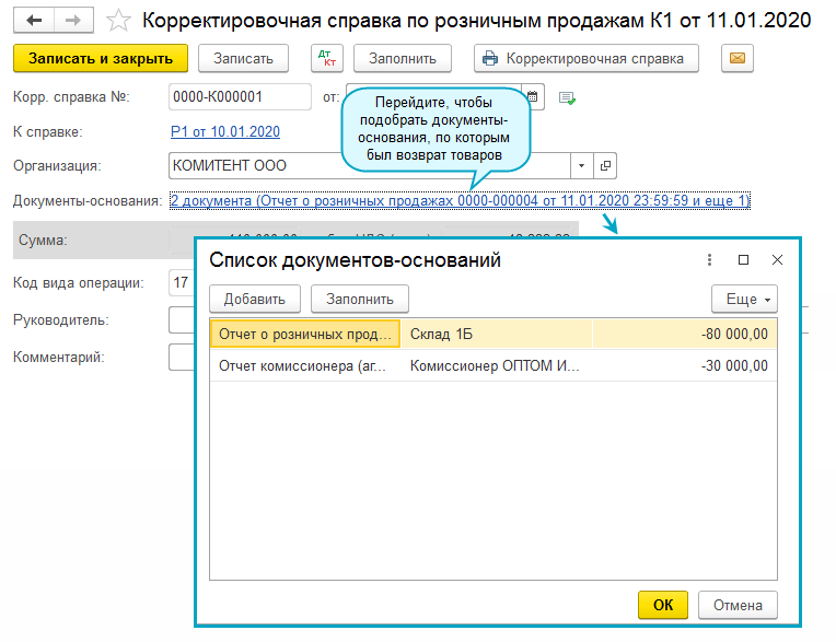 В случае возврата розничных товаров от комиссионера можно оформить Корректировочную справку по розничным продажам.