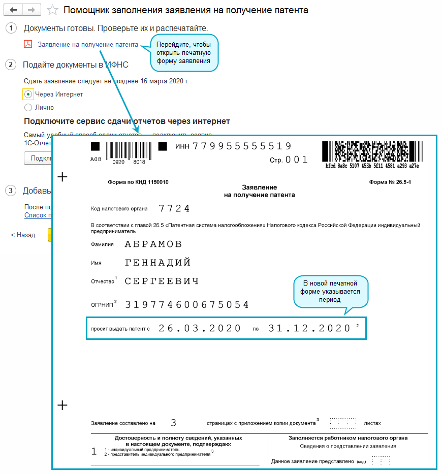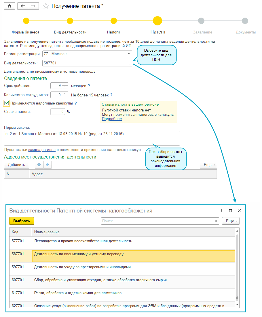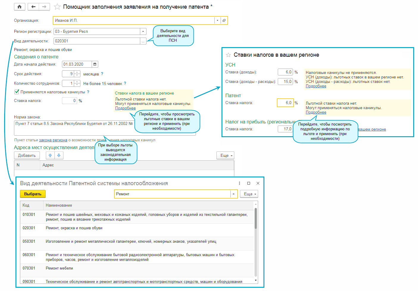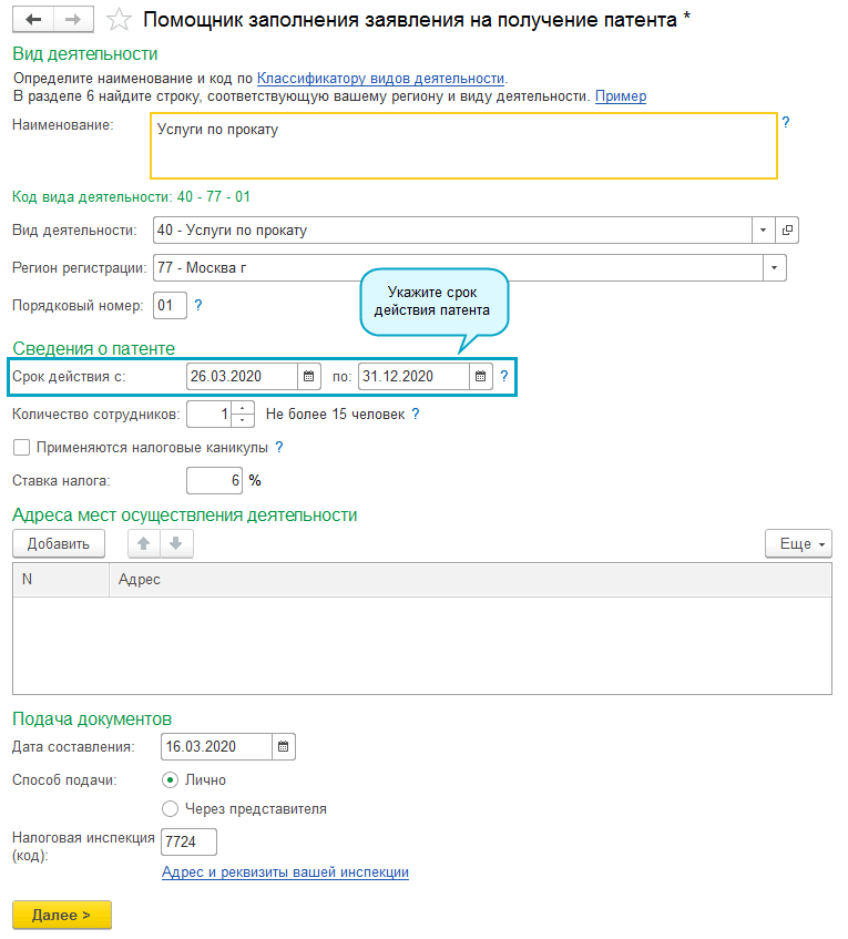 Стоимость патента рассчитывается автоматически с учетом особенностей регионального законодательства. Сервис доступен только для пользователей 1С:БухОбслуживания.